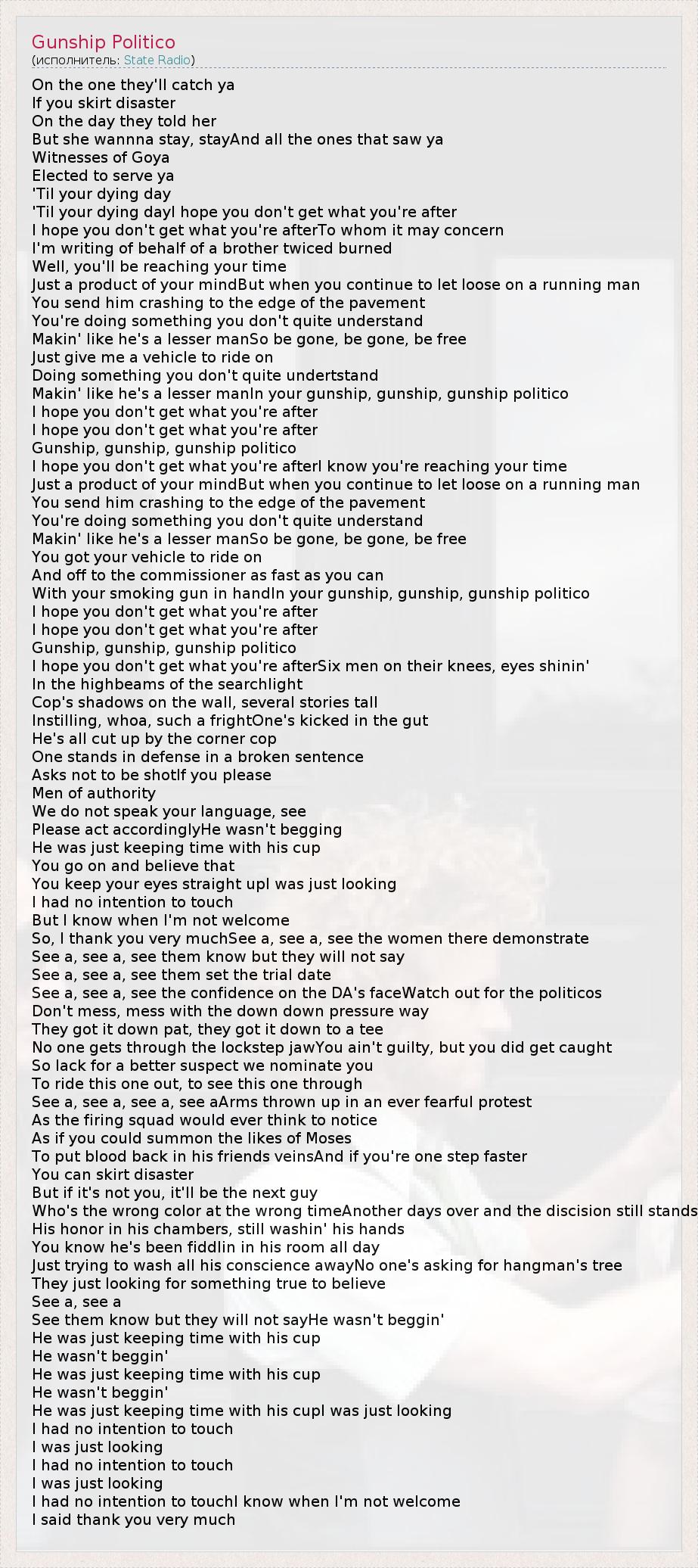 А как ты думаешь, о чем песня "Gunship Politico" ?