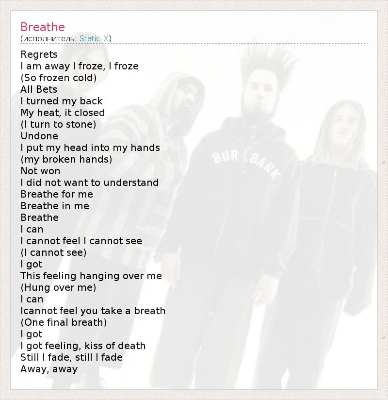Regrets I am away I froze, I froze (So frozen cold) All Bets I turned my back My heat, it closed (I turn to stone) Undone I put my head into my hands (my broken hands) Not won I did not want to understand Breathe for me Breathe in me Breathe I can I cannot feel I cannot see (I cannot see) I got This feeling hanging over me (Hung over me) I can Icannot feel you take a breath (One final breath) I got I got feeling, kiss of death Still I fade, still I fade Away, away