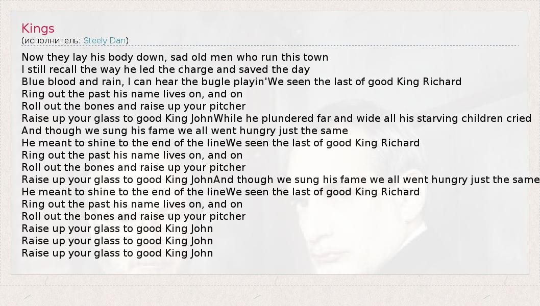 Raise up your glass to good King JohnAnd though we sung his fame we all went hungry just the same
