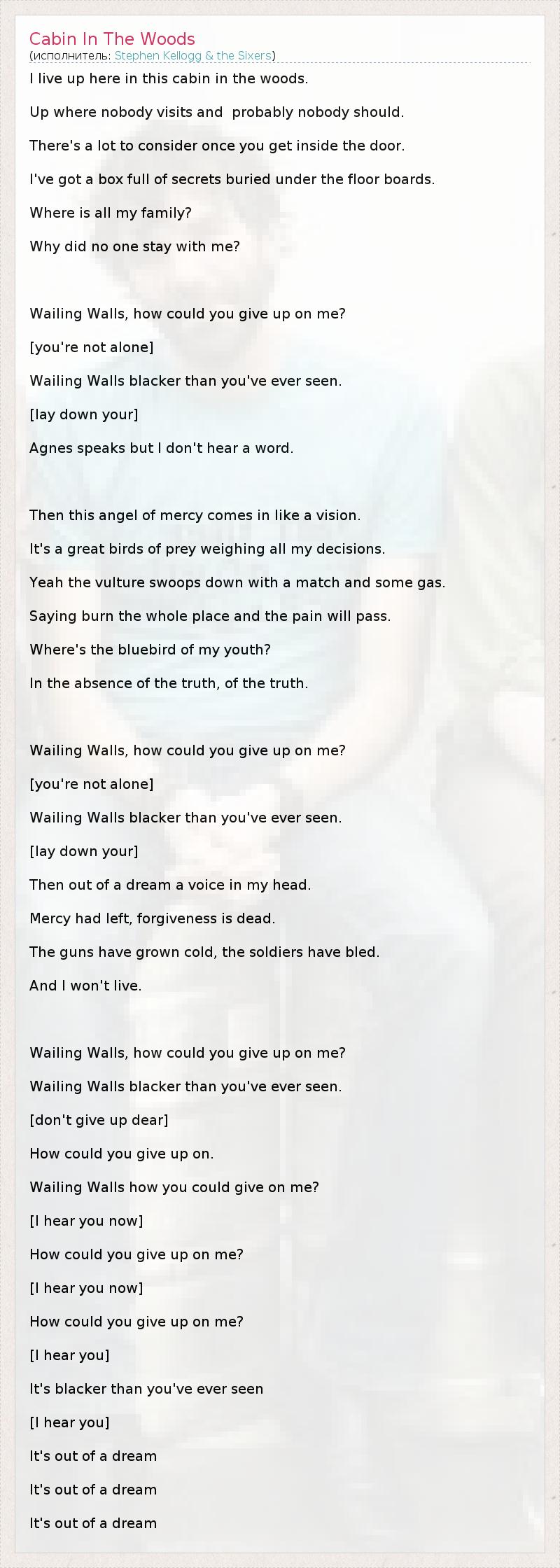I live up here in this cabin in the woods. Up where nobody visits and probably nobody should. There's a lot to consider once you get inside the door. I've got a box full of secrets buried under the floor boards. Where is all my family? Why did no one stay with me? Wailing Walls, how could you give up on me? [you're not alone] Wailing Walls blacker than you've ever seen. [lay down your ] Agnes speaks but I don't hear a word. Then this angel of mercy comes in like a vision. It's a great birds of prey weighing all my decisions. Yeah the vulture swoops down with a match and some gas. Saying burn the whole place and the pain will pass. Where's the bluebird of my youth? In the absence of the truth, of the truth. Wailing Walls, how could you give up on me? [you're not alone] Wailing Walls blacker than you've ever seen. [lay down your ] Then out of a dream a voice in my head. Mercy had left, forgiveness is dead. The guns have grown cold, the soldiers have bled. And I won't live. Wailing Walls, how could you give up on me? Wailing Walls blacker than you've ever seen. [don't give up dear] How could you give up on. Wailing Walls how you could give on me? [I hear you now] How could you give up on me? [I hear you now] How could you give up on me? [I hear you] It's blacker than you've ever seen [I hear you] It's out of a dream It's out of a dream It's out of a dream