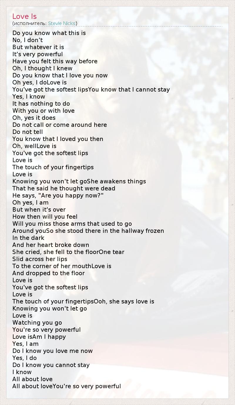 Это интересно:Стиви Никс родилась 26 мая 1948 года в Финиксе, штат Аризона, США. Она является одной из талантливейших и известнейших американских исполнительниц, обладательницей большого количества музыкальных премий и наград. Особую популярность получила благодаря работе в рамках группы Fleetwood Mac. Певица исполняет свои композиции в лирическом, но в то же самое время тяжелом стиле, тем самым создавая... продолжение