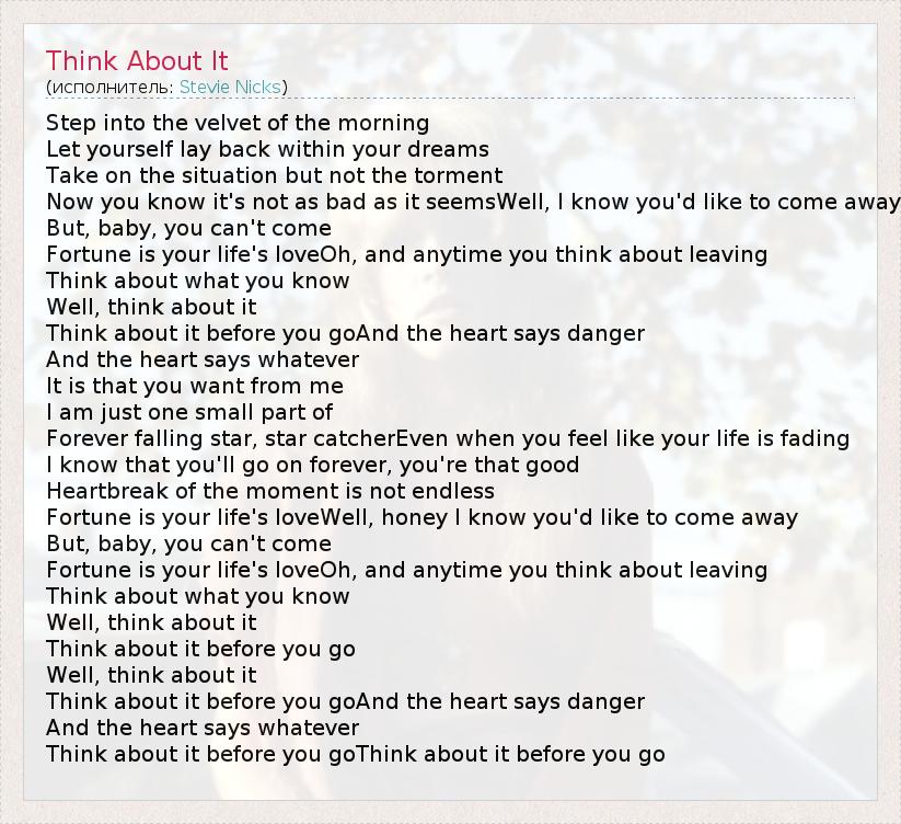 Step into the velvet of the morning Let yourself lay back within your dreams Take on the situation but not the torment Now you know it's not as bad as it seemsWell, I know you'd like to come away But, baby, you can't come Fortune is your life's loveOh, and anytime you think about leaving Think about what you know Well, think about it Think about it before you goAnd the heart says danger And the heart says whatever It is that you want from me I am just one small part of Forever falling star, star catcherEven when you feel like your life is fading I know that you'll go on forever, you're that good Heartbreak of the moment is not endless Fortune is your life's loveWell, honey I know you'd like to come away But, baby, you can't come Fortune is your life's loveOh, and anytime you think about leaving Think about what you know Well, think about it Think about it before you go Well, think about it Think about it before you goAnd the heart says danger And the heart says whatever Think about it before you goThink about it before you go