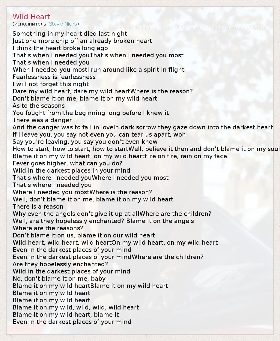 Something in my heart died last night Just one more chip off an already broken heart I think the heart broke long ago That's when I needed youThat's when I needed you most That's when I needed you When I needed you mostI run around like a spirit in flight Fearlessness is fearlessness I will not forget this night Dare my wild heart, dare my wild heartWhere is the reason? Don't blame it on me, blame it on my wild heart As to the seasons You fought from the beginning long before I knew it There was a danger And the danger was to fall in loveIn dark sorrow they gaze down into the darkest heart If I leave you, you say not even you can tear us apart, woh Say you're leaving, you say you don't even know How to start, how to start, how to startWell, believe it then and don't blame it on my soul Blame it on my wild heart, on my wild heartFire on fire, rain on my face Fever goes higher, what can you do? Wild in the darkest places in your mind That's where I needed youWhere I needed you most That's where I needed you Where I needed you mostWhere is the reason? Well, don't blame it on me, blame it on my wild heart There is a reason Why even the angels don't give it up at allWhere are the children? Well, are they hopelessly enchanted? Blame it on the angels Where are the reasons? Don't blame it on us, blame it on our wild heart Wild heart, wild heart, wild heartOn my wild heart, on my wild heart Even in the darkest places of your mind Even in the darkest places of your mindWhere are the children? Are they hopelessly enchanted? Wild in the darkest places of your mind No, don't blame it on me, baby Blame it on my wild heartBlame it on my wild heart Blame it on my wild heart Blame it on my wild heart Blame it on my wild, wild, wild, wild heart Blame it on my wild heart, blame it Even in the darkest places of your mind