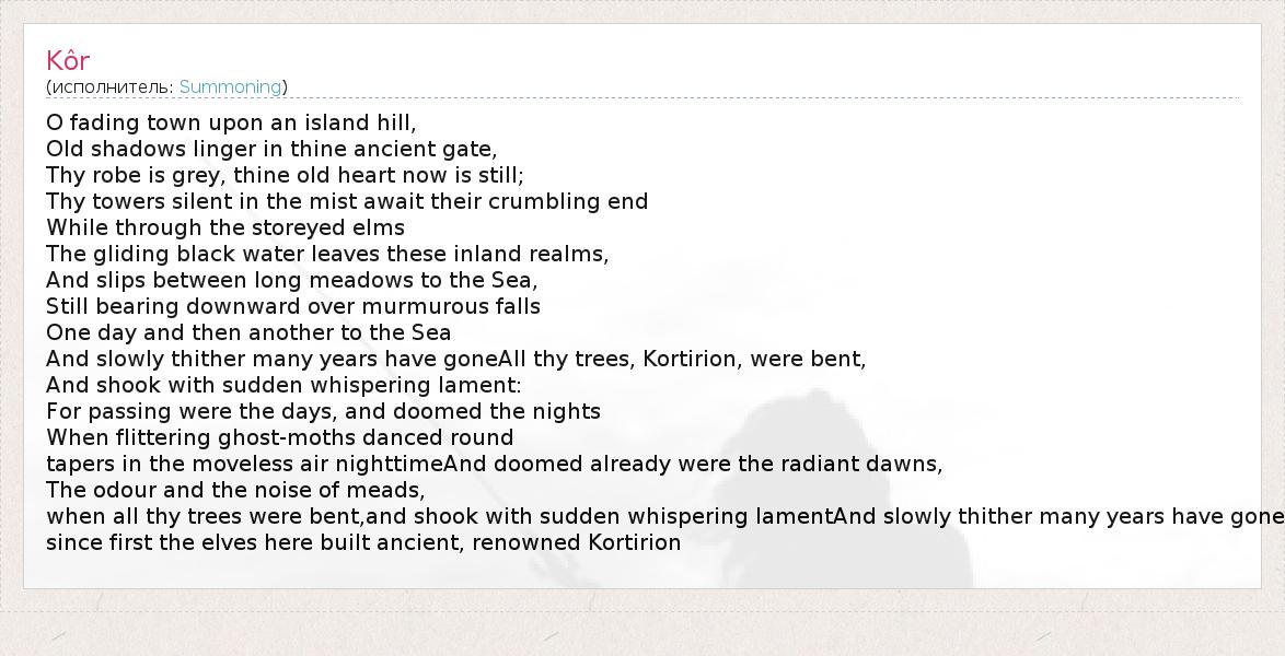 Это интересно:Summoning (англ. «Призывание») - дуэт из Австрии, исполняющий музыку в стиле эпичного атмосферного блэк метала. Стиль Summoning заметно отличается медленным темпом, активным использованием клавишных. Большая часть текстов группы посвящена миру Средиземья Дж. Р. Р. Толкина, а также основана на творчестве ещё одного писателя-фантаста - Майкла Джона Муркока.Первый альбом Lugburz... продолжение