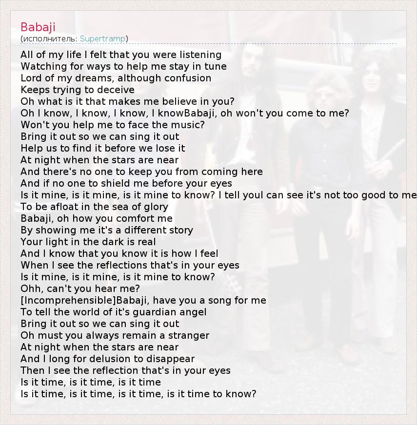 Это интересно:Supertramp (супертрэ́мп) — британская рок-группа, чью музыку относят к направлениям прогрессивный рок и поп-рок. Образована Риком Дэвисом и Роджером Ходжсоном в 1969 году. Ранний период творчества группы отмечен амбициозными концептуальными альбомами, в то время как наибольшую популярность ей принесли более поздние хиты, среди которых «Dreamer», «Goodbye Stranger», «Give A Little Bit» и «The Logical Song».... продолжение