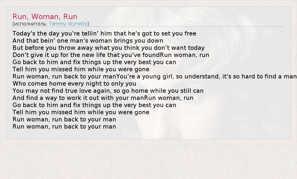 Today's the day you're tellin' him that he's got to set you free And that bein' one man's woman brings you down But before you throw away what you think you don't want today Don't give it up for the new life that you've foundRun woman, run Go back to him and fix things up the very best you can Tell him you missed him while you were gone Run woman, run back to your manYou're a young girl, so understand, it's so hard to find a man Who comes home every night to only you You may not find true love again, so go home while you still can And find a way to work it out with your manRun woman, run Go back to him and fix things up the very best you can Tell him you missed him while you were gone Run woman, run back to your man Run woman, run back to your man