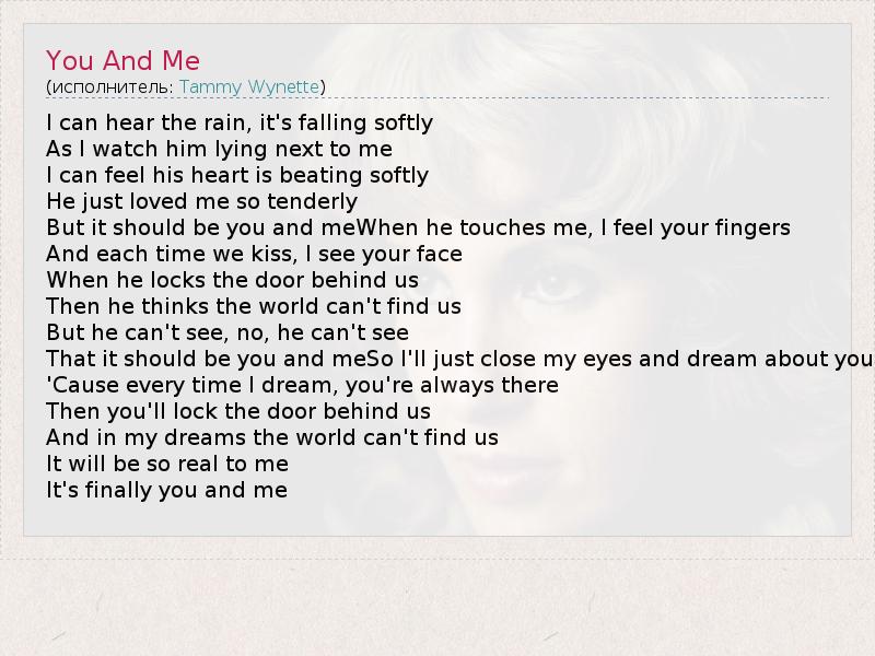 I can hear the rain, it's falling softly As I watch him lying next to me I can feel his heart is beating softly He just loved me so tenderly But it should be you and meWhen he touches me, I feel your fingers And each time we kiss, I see your face When he locks the door behind us Then he thinks the world can't find us But he can't see, no, he can't see That it should be you and meSo I'll just close my eyes and dream about you 'Cause every time I dream, you're always there Then you'll lock the door behind us And in my dreams the world can't find us It will be so real to me It's finally you and me