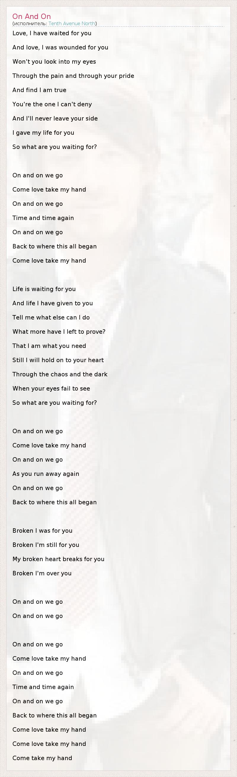 Love, I have waited for you And love, I was wounded for you Won't you look into my eyes Through the pain and through your pride And find I am true You're the one I can't deny And I'll never leave your side I gave my life for you So what are you waiting for? On and on we go Come love take my hand On and on we go Time and time again On and on we go Back to where this all began Come love take my hand Life is waiting for you And life I have given to you Tell me what else can I do What more have I left to prove? That I am what you need Still I will hold on to your heart Through the chaos and the dark When your eyes fail to see So what are you waiting for? On and on we go Come love take my hand On and on we go As you run away again On and on we go Back to where this all began Broken I was for you Broken I'm still for you My broken heart breaks for you Broken I'm over you On and on we go On and on we go On and on we go Come love take my hand On and on we go Time and time again On and on we go Back to where this all began Come love take my hand Come love take my hand Come take my hand
