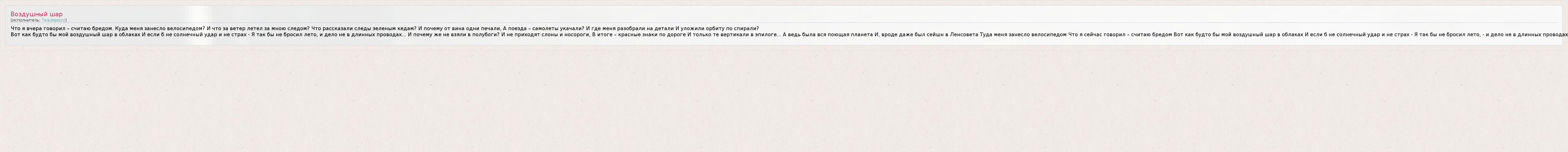 Вот как будто бы мой воздушный шар в облаках И если б не солнечный удар и не страх - Я так бы не бросил лето, и дело не в длинных проводах... И почему же не взяли в полубоги? И не приходят слоны и носороги, В итоге – красные знаки по дороге И только те вертикали в эпилоге... А ведь была вся поющая планета И, вроде даже был сейшн в Ленсовета Туда меня занесло велосипедом Что я сейчас говорил – считаю бредом Вот как будто бы мой воздушный шар в облаках И если б не солнечный удар и не страх - Я так бы не бросил лето, - и дело не в длинных проводах