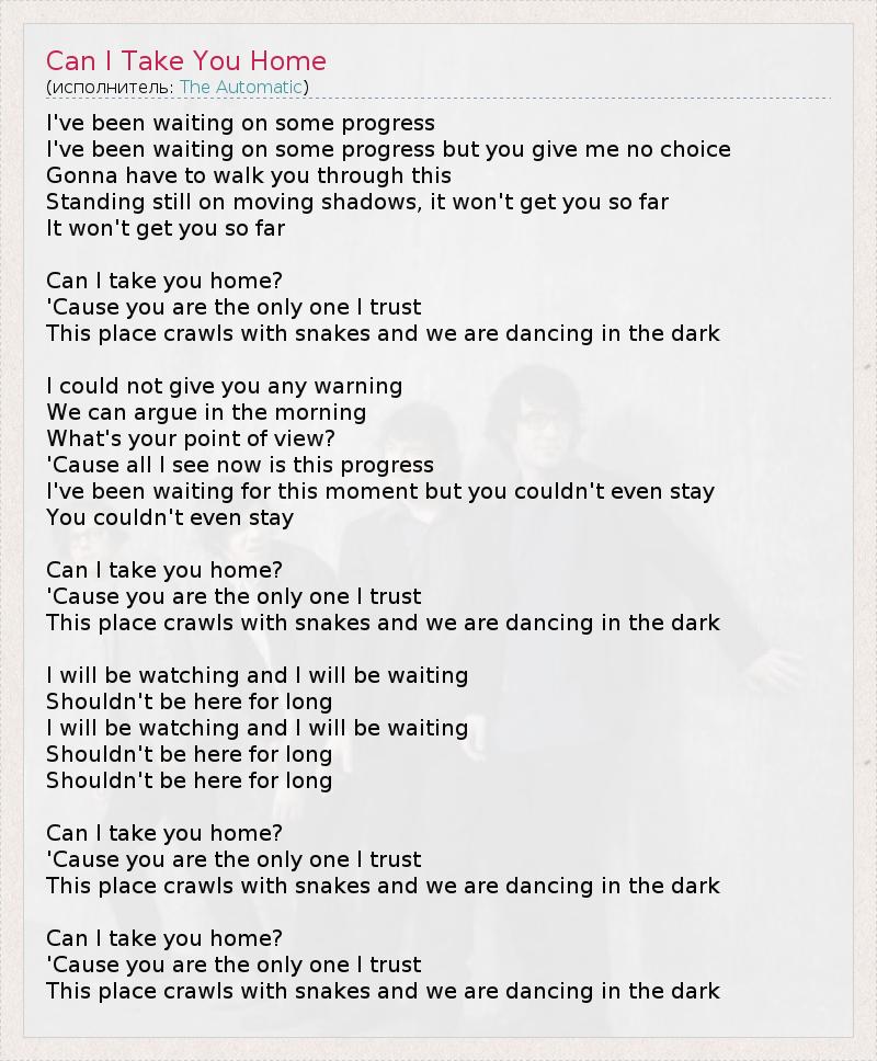 I've been waiting on some progress I've been waiting on some progress but you give me no choice Gonna have to walk you through this Standing still on moving shadows, it won't get you so far It won't get you so far Can I take you home? 'Cause you are the only one I trust This place crawls with snakes and we are dancing in the dark I could not give you any warning We can argue in the morning What's your point of view? 'Cause all I see now is this progress I've been waiting for this moment but you couldn't even stay You couldn't even stay Can I take you home? 'Cause you are the only one I trust This place crawls with snakes and we are dancing in the dark I will be watching and I will be waiting Shouldn't be here for long I will be watching and I will be waiting Shouldn't be here for long Shouldn't be here for long Can I take you home? 'Cause you are the only one I trust This place crawls with snakes and we are dancing in the dark Can I take you home? 'Cause you are the only one I trust This place crawls with snakes and we are dancing in the dark