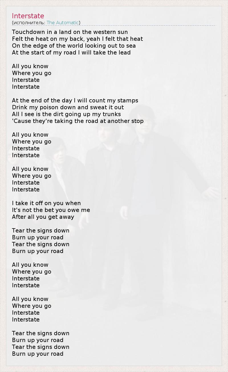 Touchdown in a land on the western sun Felt the heat on my back, yeah I felt that heat On the edge of the world looking out to sea At the start of my road I will take the lead All you know Where you go Interstate Interstate At the end of the day I will count my stamps Drink my poison down and sweat it out All I see is the dirt going up my trunks 'Cause they're taking the road at another stop All you know Where you go Interstate Interstate All you know Where you go Interstate Interstate I take it off on you when It's not the bet you owe me After all you get away Tear the signs down Burn up your road Tear the signs down Burn up your road All you know Where you go Interstate Interstate All you know Where you go Interstate Interstate Tear the signs down Burn up your road Tear the signs down Burn up your road