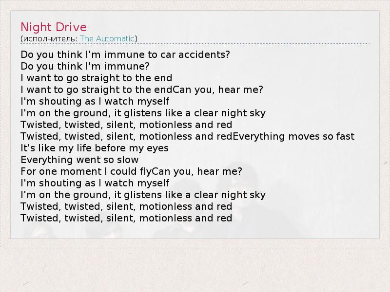 Do you think I'm immune to car accidents? Do you think I'm immune? I want to go straight to the end I want to go straight to the endCan you, hear me? I'm shouting as I watch myself I'm on the ground, it glistens like a clear night sky Twisted, twisted, silent, motionless and red Twisted, twisted, silent, motionless and redEverything moves so fast It's like my life before my eyes Everything went so slow For one moment I could flyCan you, hear me? I'm shouting as I watch myself I'm on the ground, it glistens like a clear night sky Twisted, twisted, silent, motionless and red Twisted, twisted, silent, motionless and red