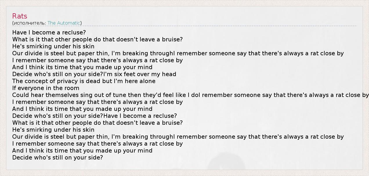 Have I become a recluse? What is it that other people do that doesn't leave a bruise? He's smirking under his skin Our divide is steel but paper thin, I'm breaking throughI remember someone say that there's always a rat close by I remember someone say that there's always a rat close by And I think its time that you made up your mind Decide who's still on your side?I'm six feet over my head The concept of privacy is dead but I'm here alone If everyone in the room Could hear themselves sing out of tune then they'd feel like I doI remember someone say that there's always a rat close by I remember someone say that there's always a rat close by And I think its time that you made up your mind Decide who's still on your side?Have I become a recluse? What is it that other people do that doesn't leave a bruise? He's smirking under his skin Our divide is steel but paper thin, I'm breaking throughI remember someone say that there's always a rat close by I remember someone say that there's always a rat close by And I think its time that you made up your mind Decide who's still on your side?