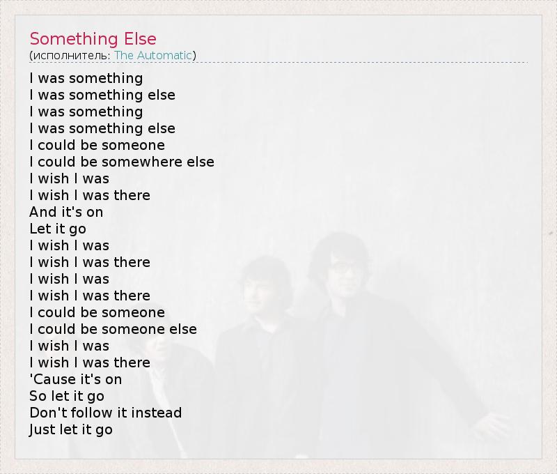 I was something I was something else I was something I was something else I could be someone I could be somewhere else I wish I was I wish I was there And it's on Let it go I wish I was I wish I was there I wish I was I wish I was there I could be someone I could be someone else I wish I was I wish I was there 'Cause it's on So let it go Don't follow it instead Just let it go