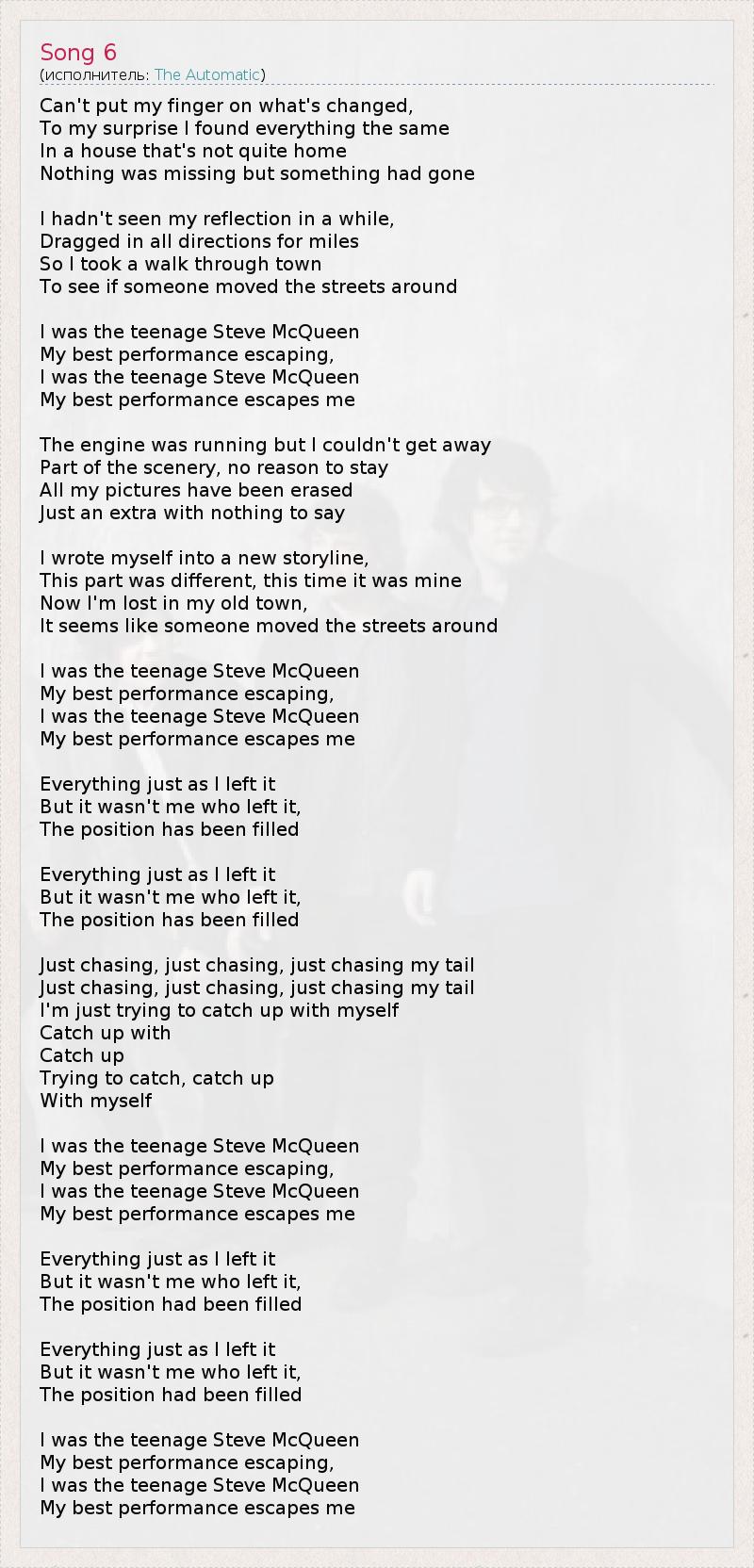 Не могу почувствовать, что же изменилось, К моему удивлению, я нашел все то же самое В доме, который уже не тот дом, что был раньше, Всего хватало, но что-то все же ушло Я не видел своего отражения какое-то время, Бродил туда-сюда, Что ж, я пошел гулять по городу, Посмотреть, на месте ли улицы Я был как Стив МакКвин* в детстве, Моя лучшая роль уходит от меня, Я был как Стив МакКвин в детстве, Моя лучшая роль не сыграна Двигатель работал, но я не мог уехать прочь, Часть той сцены, в которой нету смысла оставаться, Все мои воспоминания стерты, Нечего сказать...нечего дополнить Я написал новую историю свой жизни, Она была другой, на этот раз она была моей, Сейчас я потерян в своем старом городе, Кажется, что кто-то переместил все улицы Я был как Стив МакКвин в детстве, Моя лучшая роль уходит от меня, Я был как Стив МакКвин в детстве, Моя лучшая роль не сыграна Все,как я оставил, Но это был не я, Мое место было заполнено... Все, как я оставил, Но это был не я, Мое место было заполнено... Просто метаюсь бессмысленно, Просто метаюсь бессмысленно, Я просто пытаюсь догнать сам себя, Догнать.... Догнать Стараюсь догнать, догнать Сам себя Я был как Стив МакКвин в детстве, Моя лучшая роль уходит от меня, Я был как Стив МакКвин в детстве, Моя лучшая роль не сыграна Все,как я оставил, Но это был не я, Мое место было заполнено... Все, как я оставил, Но это был не я, Мое место было заполнено Я был как Стив МакКвин в детстве, Моя лучшая роль уходит от меня, Я был как Стив МакКвин в детстве, Моя лучшая роль не сыграна * американский актер