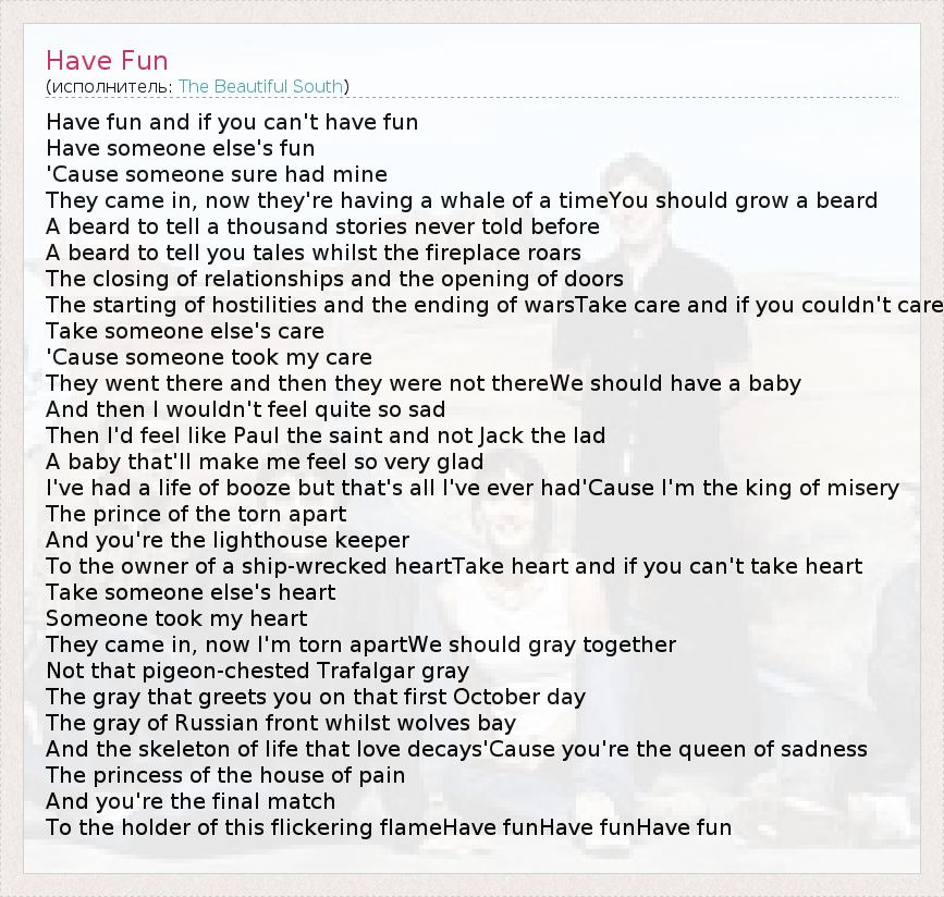 Have fun and if you can't have fun Have someone else's fun 'Cause someone sure had mine They came in, now they're having a whale of a timeYou should grow a beard A beard to tell a thousand stories never told before A beard to tell you tales whilst the fireplace roars The closing of relationships and the opening of doors The starting of hostilities and the ending of warsTake care and if you couldn't care Take someone else's care 'Cause someone took my care They went there and then they were not thereWe should have a baby And then I wouldn't feel quite so sad Then I'd feel like Paul the saint and not Jack the lad A baby that'll make me feel so very glad I've had a life of booze but that's all I've ever had'Cause I'm the king of misery The prince of the torn apart And you're the lighthouse keeper To the owner of a ship-wrecked heartTake heart and if you can't take heart Take someone else's heart Someone took my heart They came in, now I'm torn apartWe should gray together Not that pigeon-chested Trafalgar gray The gray that greets you on that first October day The gray of Russian front whilst wolves bay And the skeleton of life that love decays'Cause you're the queen of sadness The princess of the house of pain And you're the final match To the holder of this flickering flameHave funHave funHave fun