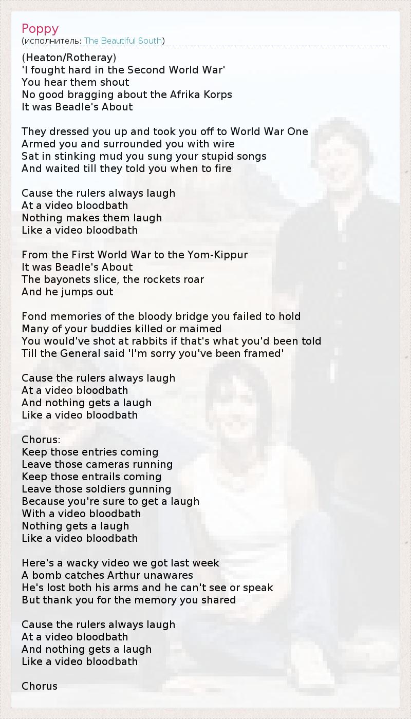 (Heaton/Rotheray) 'I fought hard in the Second World War' You hear them shout No good bragging about the Afrika Korps It was Beadle's About They dressed you up and took you off to World War One Armed you and surrounded you with wire Sat in stinking mud you sung your stupid songs And waited till they told you when to fire Cause the rulers always laugh At a video bloodbath Nothing makes them laugh Like a video bloodbath From the First World War to the Yom-Kippur It was Beadle's About The bayonets slice, the rockets roar And he jumps out Fond memories of the bloody bridge you failed to hold Many of your buddies killed or maimed You would've shot at rabbits if that's what you'd been told Till the General said 'I'm sorry you've been framed' Cause the rulers always laugh At a video bloodbath And nothing gets a laugh Like a video bloodbath Chorus: Keep those entries coming Leave those cameras running Keep those entrails coming Leave those soldiers gunning Because you're sure to get a laugh With a video bloodbath Nothing gets a laugh Like a video bloodbath Here's a wacky video we got last week A bomb catches Arthur unawares He's lost both his arms and he can't see or speak But thank you for the memory you shared Cause the rulers always laugh At a video bloodbath And nothing gets a laugh Like a video bloodbath Chorus