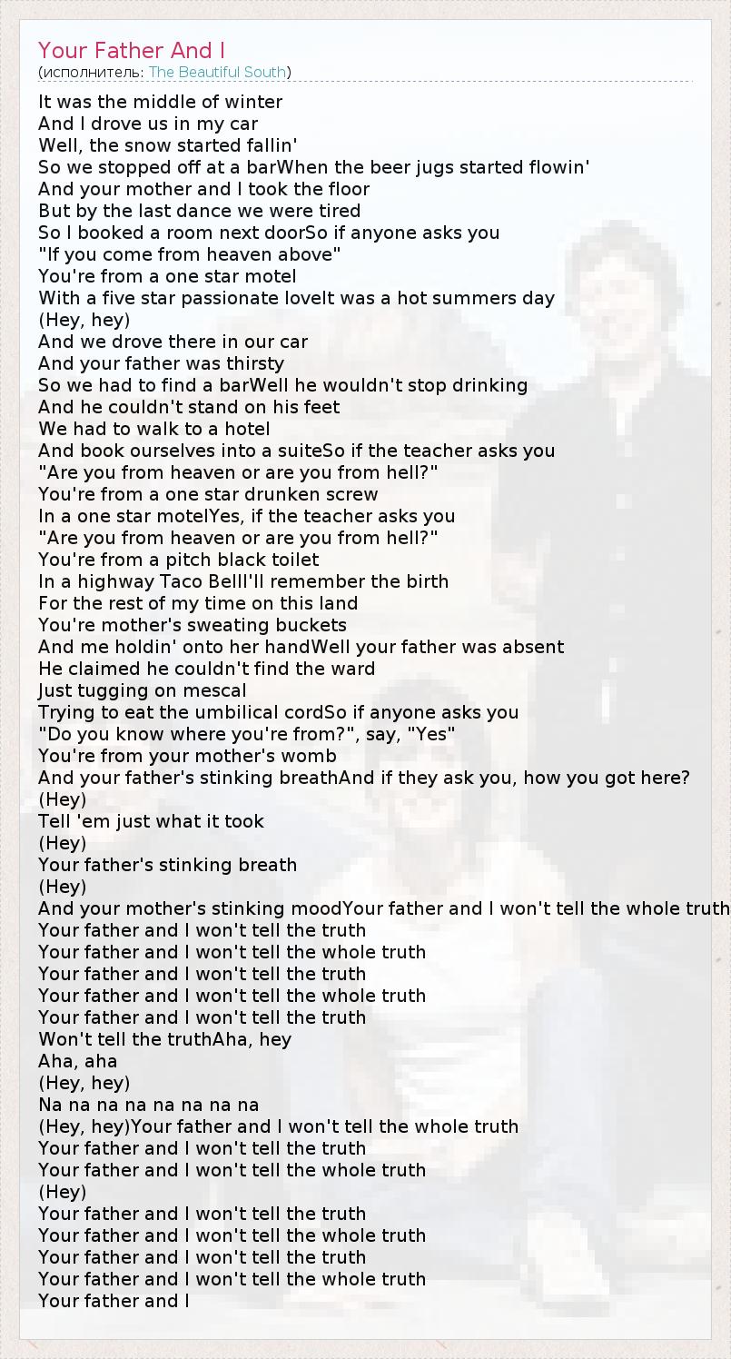 And your mother's stinking moodYour father and I won't tell the whole truth