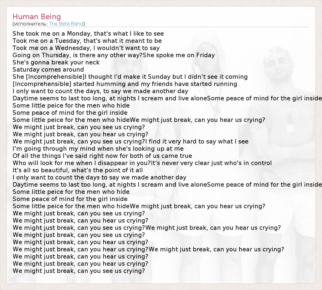 She took me on a Monday, that's what I like to see Took me on a Tuesday, that's what it meant to be Took me on a Wednesday, I wouldn't want to say Going on Thursday, is there any other way?She spoke me on Friday She's gonna break your neck Saturday comes around She [Incomprehensible]I thought I'd make it Sunday but I didn't see it coming [Incomprehensible] started humming and my friends have started running I only want to count the days, to say we made another day Daytime seems to last too long, at nights I scream and live aloneSome peace of mind for the girl inside Some little peice for the men who hide Some peace of mind for the girl inside Some little peice for the men who hideWe might just break, can you hear us crying? We might just break, can you see us crying? We might just break, can you hear us crying? We might just break, can you see us crying?I find it very hard to say what I see I'm going through my mind when she's looking up at me Of all the things I've said right now for both of us came true Who will look for me when I disappear in you?It's never very clear just who's in control It's all so beautiful, what's the point of it all I only want to count the days to say we made another day Daytime seems to last too long, at nights I scream and live aloneSome peace of mind for the girl inside Some little peice for the men who hide Some peace of mind for the girl inside Some little peice for the men who hideWe might just break, can you hear us crying? We might just break, can you see us crying? We might just break, can you hear us crying? We might just break, can you see us crying?We might just break, can you hear us crying? We might just break, can you see us crying? We might just break, can you hear us crying? We might just break, can you hear us crying?We might just break, can you hear us crying? We might just break, can you hear us crying? We might just break, can you hear us crying? We might just break, can you see us crying?