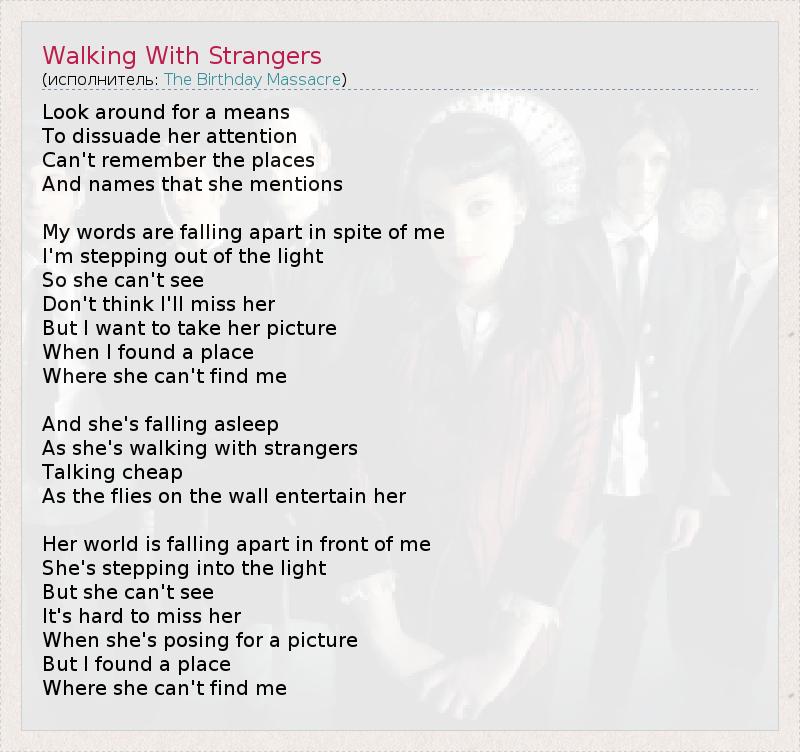 А как ты думаешь, о чем песня "Walking With Strangers" ?