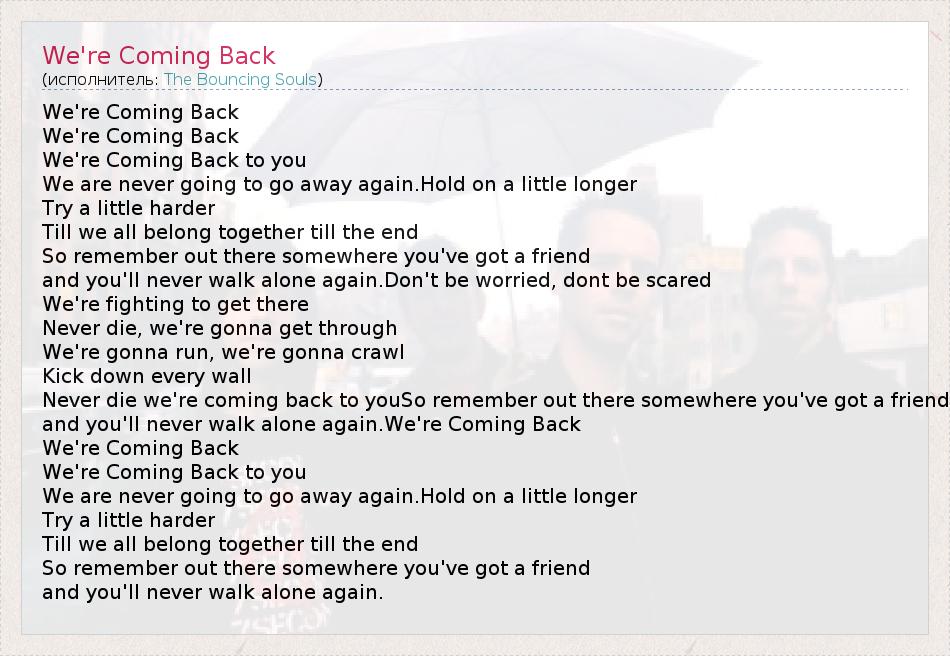 We're Coming Back We're Coming Back We're Coming Back to you We are never going to go away again.Hold on a little longer Try a little harder Till we all belong together till the end So remember out there somewhere you've got a friend and you'll never walk alone again.Don't be worried, dont be scared We're fighting to get there Never die, we're gonna get through We're gonna run, we're gonna crawl Kick down every wall Never die we're coming back to youSo remember out there somewhere you've got a friend and you'll never walk alone again.We're Coming Back We're Coming Back We're Coming Back to you We are never going to go away again.Hold on a little longer Try a little harder Till we all belong together till the end So remember out there somewhere you've got a friend and you'll never walk alone again.