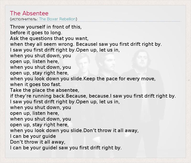Это интересно:The Boxer Rebellion – международный рок-проект, в состав которого входят 4 участника из разных стран мира - Натан Николсон (Nathan Nicholson) (Vocals/Guitar/Keys) из США, Тодд Хоу (Todd Howe) (Lead Guitar) из Австралии и двое англичан - Адам Харрисон (Adam Harrison) (Bass Guitar) и Пьерс Хьюит (Piers Hewitt) (Drums). Группа впервые собралась в 2001 году. На их счету... продолжение