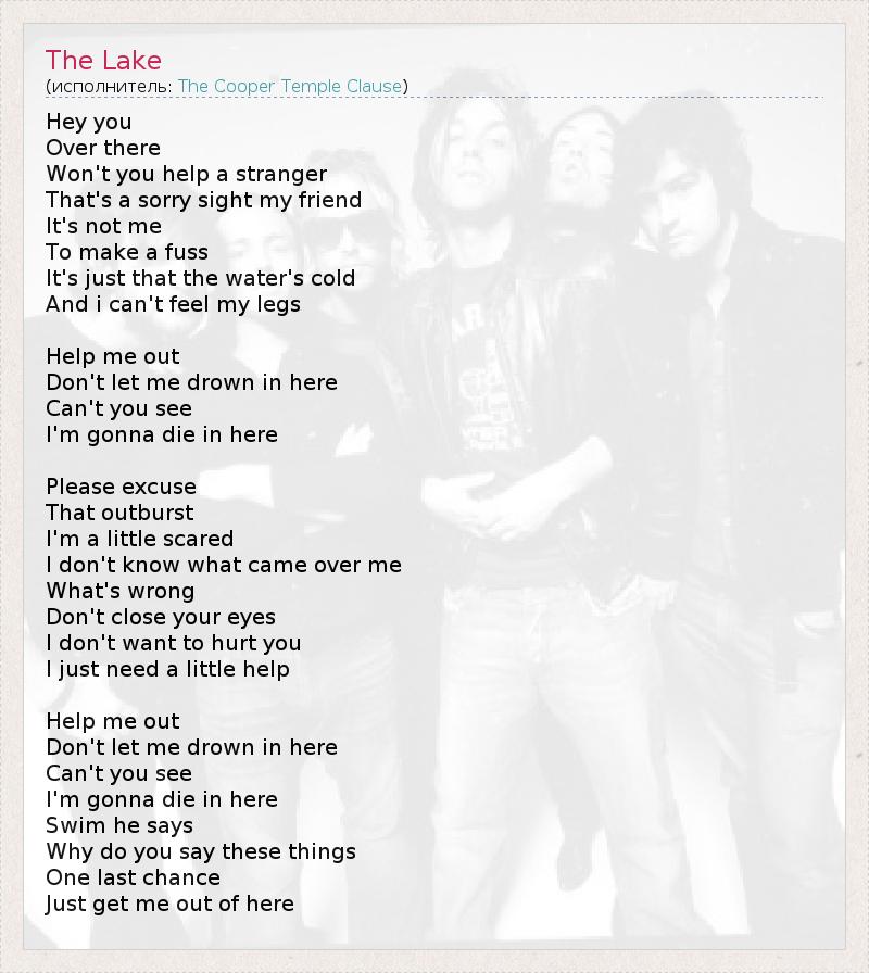 Hey you Over there Won't you help a stranger That's a sorry sight my friend It's not me To make a fuss It's just that the water's cold And i can't feel my legs Help me out Don't let me drown in here Can't you see I'm gonna die in here Please excuse That outburst I'm a little scared I don't know what came over me What's wrong Don't close your eyes I don't want to hurt you I just need a little help Help me out Don't let me drown in here Can't you see I'm gonna die in here Swim he says Why do you say these things One last chance Just get me out of here
