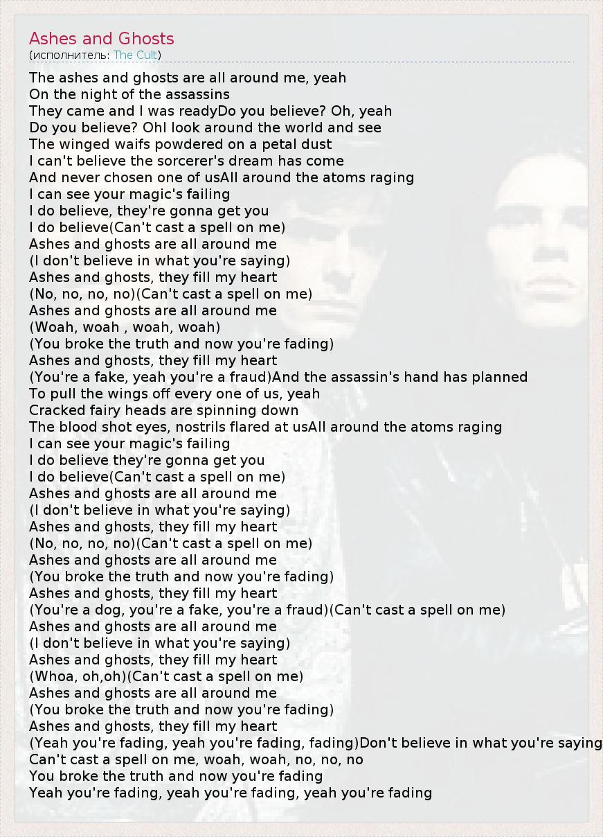 The ashes and ghosts are all around me, yeah On the night of the assassins They came and I was readyDo you believe? Oh, yeah Do you believe? OhI look around the world and see The winged waifs powdered on a petal dust I can't believe the sorcerer's dream has come And never chosen one of usAll around the atoms raging I can see your magic's failing I do believe, they're gonna get you I do believe(Can't cast a spell on me) Ashes and ghosts are all around me (I don't believe in what you're saying) Ashes and ghosts, they fill my heart (No, no, no, no)(Can't cast a spell on me) Ashes and ghosts are all around me (Woah, woah , woah, woah) (You broke the truth and now you're fading) Ashes and ghosts, they fill my heart (You're a fake, yeah you're a fraud)And the assassin's hand has planned To pull the wings off every one of us, yeah Cracked fairy heads are spinning down The blood shot eyes, nostrils flared at usAll around the atoms raging I can see your magic's failing I do believe they're gonna get you I do believe(Can't cast a spell on me) Ashes and ghosts are all around me (I don't believe in what you're saying) Ashes and ghosts, they fill my heart (No, no, no, no)(Can't cast a spell on me) Ashes and ghosts are all around me (You broke the truth and now you're fading) Ashes and ghosts, they fill my heart (You're a dog, you're a fake, you're a fraud)(Can't cast a spell on me) Ashes and ghosts are all around me (I don't believe in what you're saying) Ashes and ghosts, they fill my heart (Whoa, oh,oh)(Can't cast a spell on me) Ashes and ghosts are all around me (You broke the truth and now you're fading) Ashes and ghosts, they fill my heart (Yeah you're fading, yeah you're fading, fading)Don't believe in what you're saying Can't cast a spell on me, woah, woah, no, no, no You broke the truth and now you're fading Yeah you're fading, yeah you're fading, yeah you're fading