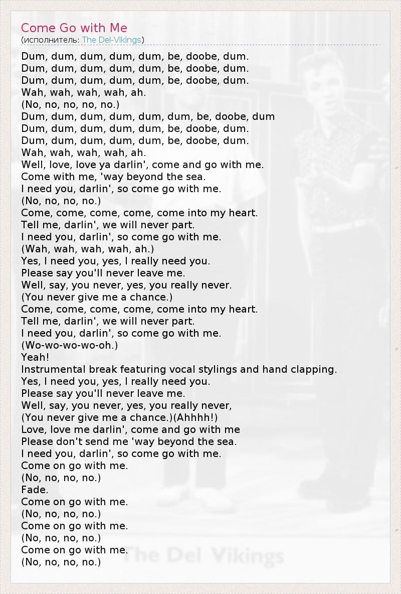 Dum, dum, dum, dum, dum, be, doobe, dum. Dum, dum, dum, dum, dum, be, doobe, dum. Dum, dum, dum, dum, dum, be, doobe, dum. Wah, wah, wah, wah, ah. (No, no, no, no, no.) Dum, dum, dum, dum, dum, dum, be, doobe, dum Dum, dum, dum, dum, dum, be, doobe, dum. Dum, dum, dum, dum, dum, be, doobe, dum. Wah, wah, wah, wah, ah. Well, love, love ya darlin', come and go with me. Come with me, 'way beyond the sea. I need you, darlin', so come go with me. (No, no, no, no.) Come, come, come, come, come into my heart. Tell me, darlin', we will never part. I need you, darlin', so come go with me. (Wah, wah, wah, wah, ah.) Yes, I need you, yes, I really need you. Please say you'll never leave me. Well, say, you never, yes, you really never. (You never give me a chance.) Come, come, come, come, come into my heart. Tell me, darlin', we will never part. I need you, darlin', so come go with me. (Wo-wo-wo-wo-oh.) Yeah! Instrumental break featuring vocal stylings and hand clapping. Yes, I need you, yes, I really need you. Please say you'll never leave me. Well, say, you never, yes, you really never, (You never give me a chance.)(Ahhhh!) Love, love me darlin', come and go with me Please don't send me 'way beyond the sea. I need you, darlin', so come go with me. Come on go with me. (No, no, no, no.) Fade. Come on go with me. (No, no, no, no.) Come on go with me. (No, no, no, no.) Come on go with me. (No, no, no, no.)