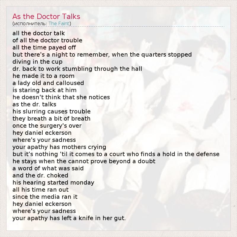 А как ты думаешь, о чем песня "As the Doctor Talks" ?
