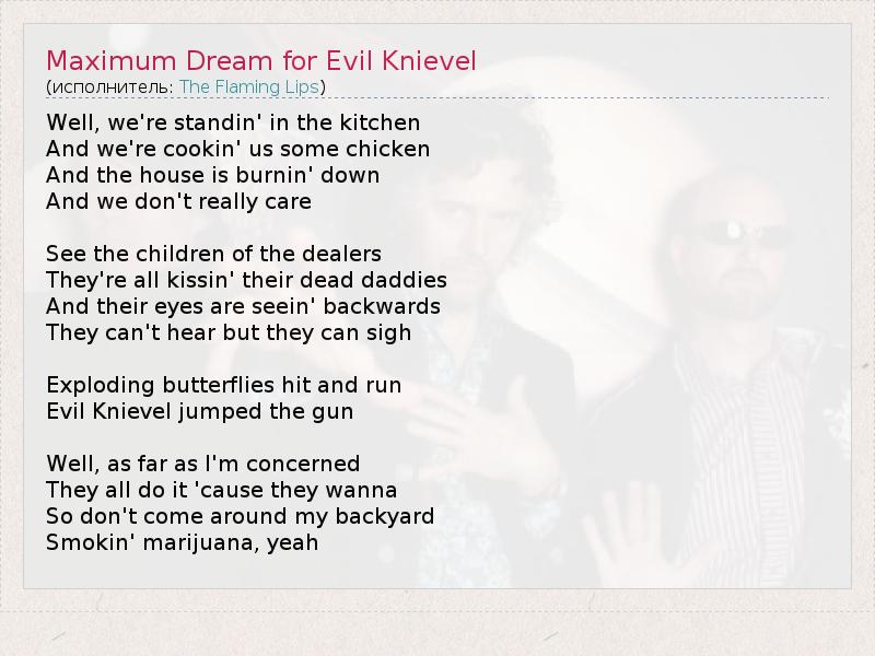 А как ты думаешь, о чем песня "Maximum Dream for Evil Knievel" ?