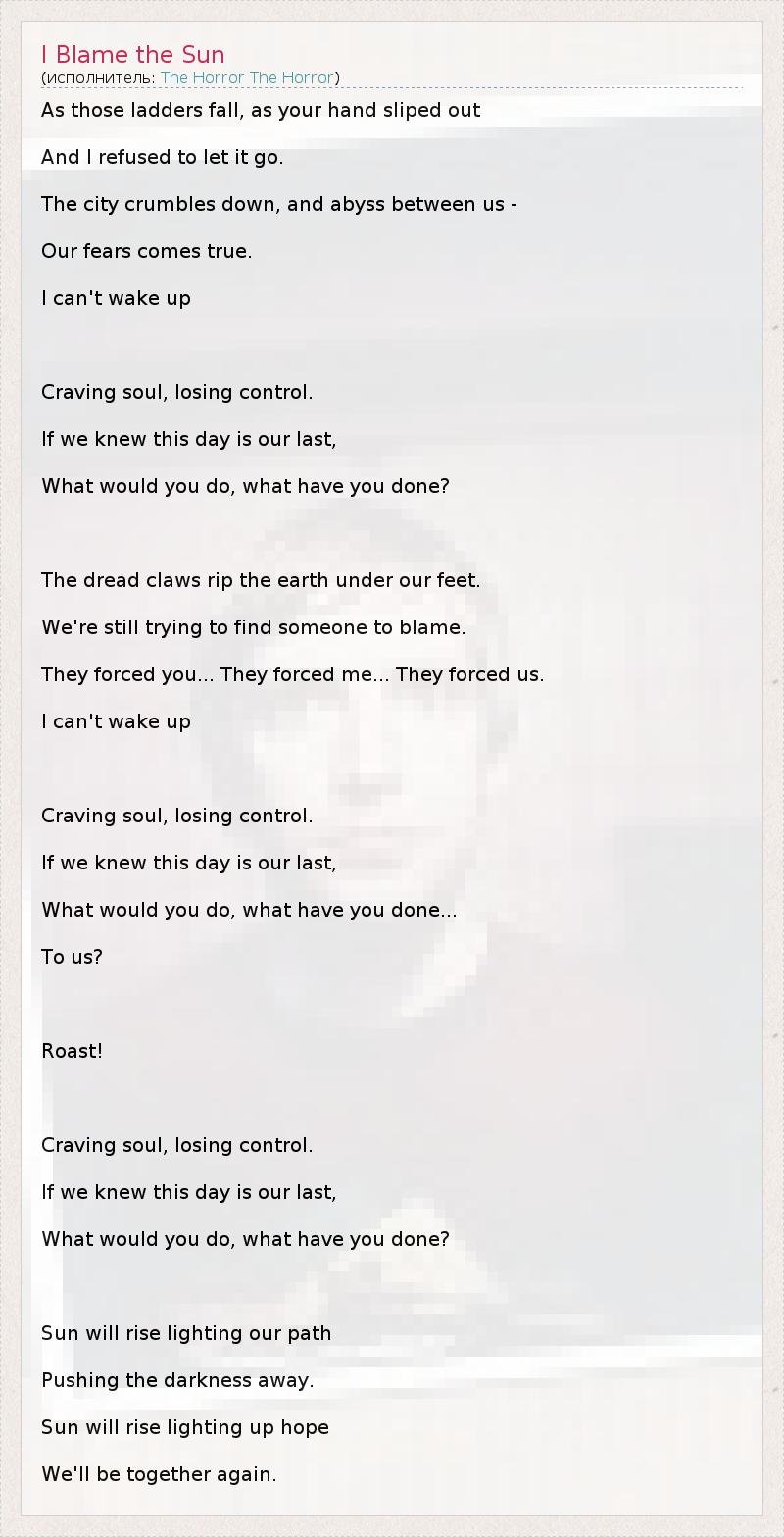 As those ladders fall, as your hand sliped out And I refused to let it go. The city crumbles down, and abyss between us - Our fears comes true. I can't wake up Craving soul, losing control. If we knew this day is our last, What would you do, what have you done? The dread claws rip the earth under our feet. We're still trying to find someone to blame. They forced you... They forced me... They forced us. I can't wake up Craving soul, losing control. If we knew this day is our last, What would you do, what have you done... To us? Roast! Craving soul, losing control. If we knew this day is our last, What would you do, what have you done? Sun will rise lighting our path Pushing the darkness away. Sun will rise lighting up hope We'll be together again.
