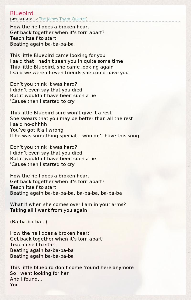 How the hell does a broken heart Get back together when it's torn apart? Teach itself to start Beating again ba-ba-ba-ba This little Bluebird came looking for you I said that I hadn't seen you in quite some time This little Bluebird, she came looking again I said we weren't even friends she could have you Don't you think it was hard? I didn't even say that you died But it wouldn't have been such a lie 'Cause then I started to cry This little Bluebird sure won't give it a rest She swears that you may be better than all the rest I said no-ohhhh You've got it all wrong If he was something special, I wouldn't have this song Don't you think it was hard? I didn't even say that you died But it wouldn't have been such a lie 'Cause then I started to cry How the hell does a broken heart Get back together when it's torn apart? Teach itself to start Beating again ba-ba-ba-ba, ba-ba-ba, ba-ba-ba What if when she comes over I am in your arms? Taking all I want from you again (Ba-ba-ba-ba...) How the hell does a broken heart Get back together when it's torn apart Teach itself to start Beating again ba-ba-ba-ba Beating again ba-ba-ba-ba This little bluebird don't come 'round here anymore So I went looking for her And I found... You.