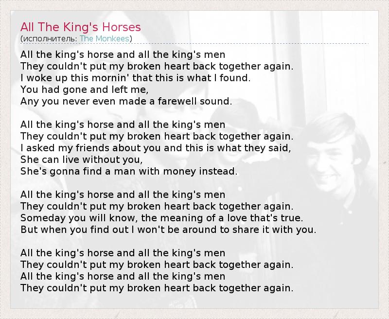 All the king's horse and all the king's men They couldn't put my broken heart back together again. I woke up this mornin' that this is what I found. You had gone and left me, Any you never even made a farewell sound. All the king's horse and all the king's men They couldn't put my broken heart back together again. I asked my friends about you and this is what they said, She can live without you, She's gonna find a man with money instead. All the king's horse and all the king's men They couldn't put my broken heart back together again. Someday you will know, the meaning of a love that's true. But when you find out I won't be around to share it with you. All the king's horse and all the king's men They couldn't put my broken heart back together again. All the king's horse and all the king's men They couldn't put my broken heart back together again.