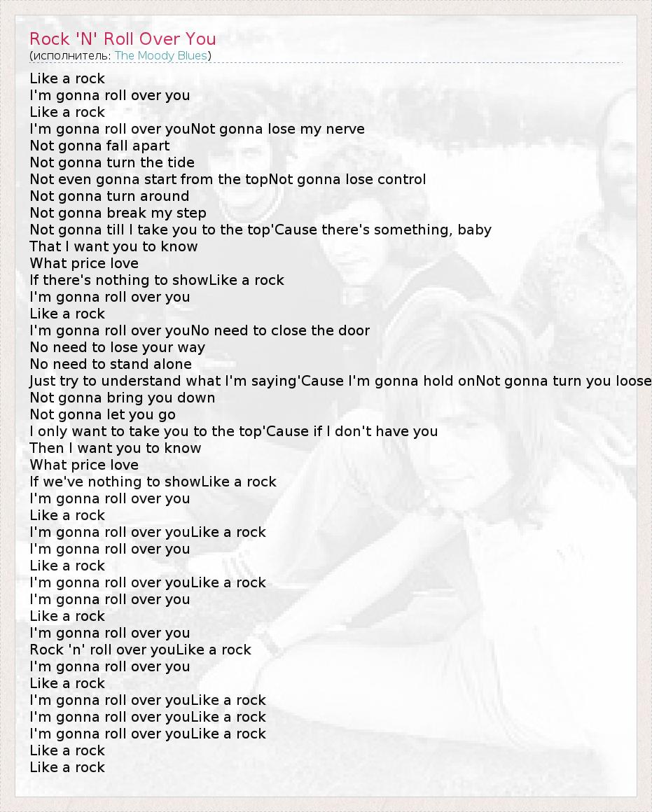 Like a rock I'm gonna roll over you Like a rock I'm gonna roll over youNot gonna lose my nerve Not gonna fall apart Not gonna turn the tide Not even gonna start from the topNot gonna lose control Not gonna turn around Not gonna break my step Not gonna till I take you to the top'Cause there's something, baby That I want you to know What price love If there's nothing to showLike a rock I'm gonna roll over you Like a rock I'm gonna roll over youNo need to close the door No need to lose your way No need to stand alone Just try to understand what I'm saying'Cause I'm gonna hold onNot gonna turn you loose Not gonna bring you down Not gonna let you go I only want to take you to the top'Cause if I don't have you Then I want you to know What price love If we've nothing to showLike a rock I'm gonna roll over you Like a rock I'm gonna roll over youLike a rock I'm gonna roll over you Like a rock I'm gonna roll over youLike a rock I'm gonna roll over you Like a rock I'm gonna roll over you Rock 'n' roll over youLike a rock I'm gonna roll over you Like a rock I'm gonna roll over youLike a rock I'm gonna roll over youLike a rock I'm gonna roll over youLike a rock Like a rock Like a rock