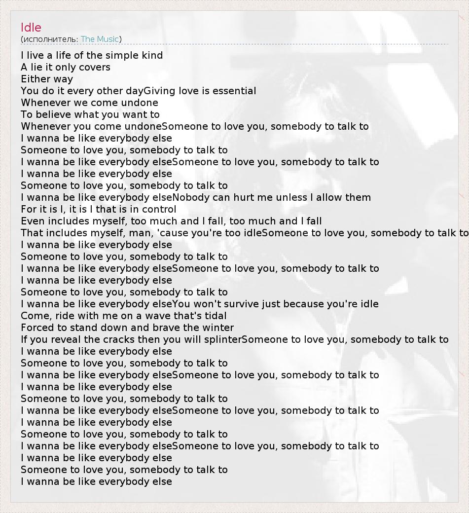 I live a life of the simple kind A lie it only covers Either way You do it every other dayGiving love is essential Whenever we come undone To believe what you want to Whenever you come undoneSomeone to love you, somebody to talk to I wanna be like everybody else Someone to love you, somebody to talk to I wanna be like everybody elseSomeone to love you, somebody to talk to I wanna be like everybody else Someone to love you, somebody to talk to I wanna be like everybody elseNobody can hurt me unless I allow them For it is I, it is I that is in control Even includes myself, too much and I fall, too much and I fall That includes myself, man, 'cause you're too idleSomeone to love you, somebody to talk to I wanna be like everybody else Someone to love you, somebody to talk to I wanna be like everybody elseSomeone to love you, somebody to talk to I wanna be like everybody else Someone to love you, somebody to talk to I wanna be like everybody elseYou won't survive just because you're idle Come, ride with me on a wave that's tidal Forced to stand down and brave the winter If you reveal the cracks then you will splinterSomeone to love you, somebody to talk to I wanna be like everybody else Someone to love you, somebody to talk to I wanna be like everybody elseSomeone to love you, somebody to talk to I wanna be like everybody else Someone to love you, somebody to talk to I wanna be like everybody elseSomeone to love you, somebody to talk to I wanna be like everybody else Someone to love you, somebody to talk to I wanna be like everybody elseSomeone to love you, somebody to talk to I wanna be like everybody else Someone to love you, somebody to talk to I wanna be like everybody else