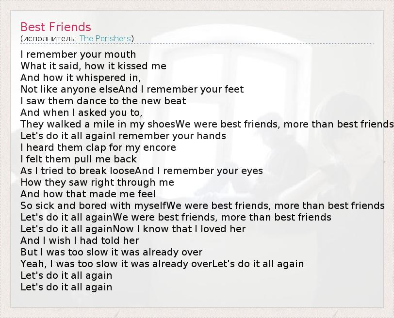 I remember your mouth What it said, how it kissed me And how it whispered in, Not like anyone elseAnd I remember your feet I saw them dance to the new beat And when I asked you to, They walked a mile in my shoesWe were best friends, more than best friends Let's do it all againI remember your hands I heard them clap for my encore I felt them pull me back As I tried to break looseAnd I remember your eyes How they saw right through me And how that made me feel So sick and bored with myselfWe were best friends, more than best friends Let's do it all againWe were best friends, more than best friends Let's do it all againNow I know that I loved her And I wish I had told her But I was too slow it was already over Yeah, I was too slow it was already overLet's do it all again Let's do it all again Let's do it all again