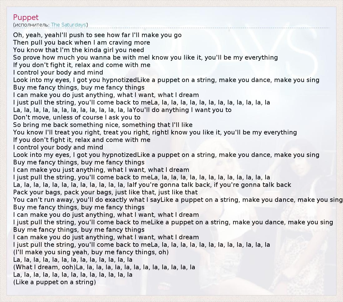 I just pull the string, you'll come back to meLike a puppet on a string, make you dance, make you sing