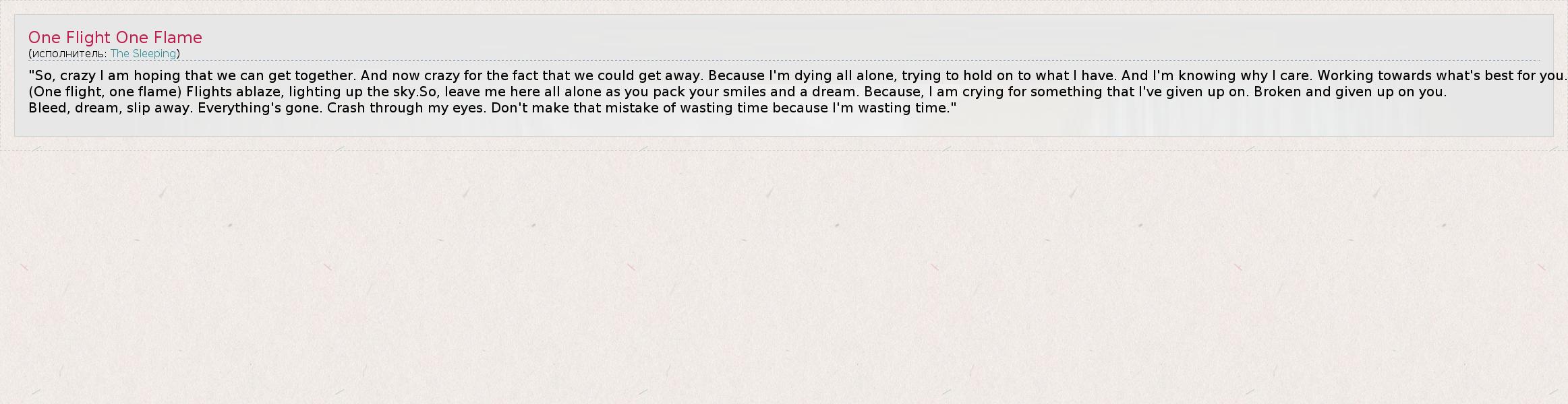 "So, crazy I am hoping that we can get together. And now crazy for the fact that we could get away. Because I'm dying all alone, trying to hold on to what I have. And I'm knowing why I care. Working towards what's best for you. (One flight, one flame) Flights ablaze, lighting up the sky.So, leave me here all alone as you pack your smiles and a dream. Because, I am crying for something that I've given up on. Broken and given up on you. Bleed, dream, slip away. Everything's gone. Crash through my eyes. Don't make that mistake of wasting time because I'm wasting time."
