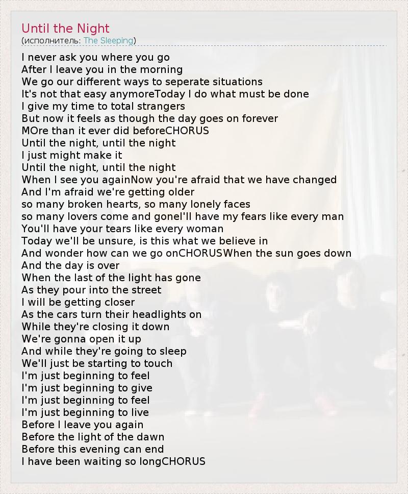 I never ask you where you go After I leave you in the morning We go our different ways to seperate situations It's not that easy anymoreToday I do what must be done I give my time to total strangers But now it feels as though the day goes on forever MOre than it ever did beforeCHORUS Until the night, until the night I just might make it Until the night, until the night When I see you againNow you're afraid that we have changed And I'm afraid we're getting older so many broken hearts, so many lonely faces so many lovers come and goneI'll have my fears like every man You'll have your tears like every woman Today we'll be unsure, is this what we believe in And wonder how can we go onCHORUSWhen the sun goes down And the day is over When the last of the light has gone As they pour into the street I will be getting closer As the cars turn their headlights on While they're closing it down We're gonna open it up And while they're going to sleep We'll just be starting to touch I'm just beginning to feel I'm just beginning to give I'm just beginning to feel I'm just beginning to live Before I leave you again Before the light of the dawn Before this evening can end I have been waiting so longCHORUS