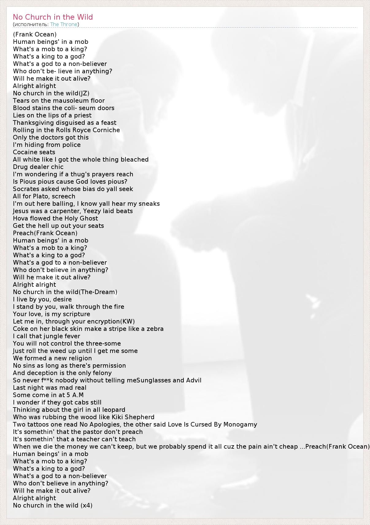 (Frank Ocean) Human beings' in a mob What's a mob to a king? What's a king to a god? What's a god to a non-believer Who don't be- lieve in anything? Will he make it out alive? Alright alright No church in the wild(JZ) Tears on the mausoleum floor Blood stains the coli- seum doors Lies on the lips of a priest Thanksgiving disguised as a feast Rolling in the Rolls Royce Corniche Only the doctors got this I'm hiding from police Cocaine seats All white like I got the whole thing bleached Drug dealer chic I'm wondering if a thug's prayers reach Is Pious pious cause God loves pious? Socrates asked whose bias do yall seek All for Plato, screech I'm out here balling, I know yall hear my sneaks Jesus was a carpenter, Yeezy laid beats Hova flowed the Holy Ghost Get the hell up out your seats Preach(Frank Ocean) Human beings' in a mob What's a mob to a king? What's a king to a god? What's a god to a non-believer Who don't believe in anything? Will he make it out alive? Alright alright No church in the wild(The-Dream) I live by you, desire I stand by you, walk through the fire Your love, is my scripture Let me in, through your encryption(KW) Coke on her black skin make a stripe like a zebra I call that jungle fever You will not control the three-some Just roll the weed up until I get me some We formed a new religion No sins as long as there's permission And deception is the only felony So never f**k nobody without telling meSunglasses and Advil Last night was mad real Some come in at 5 A.M I wonder if they got cabs still Thinking about the girl in all leopard Who was rubbing the wood like Kiki Shepherd Two tattoos one read No Apologies, the other said Love Is Cursed By Monogamy It's somethin' that the pastor don't preach It's somethin' that a teacher can't teach When we die the money we can't keep, but we probably spend it all cuz the pain ain't cheap ...Preach(Frank Ocean) Human beings' in a mob What's a mob to a king? What's a king to a god? What's a god to a non-believer Who don't believe in anything? Will he make it out alive? Alright alright No church in the wild (x4)