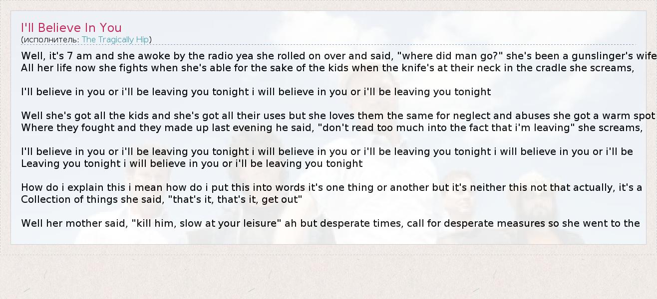 Well, it's 7 am and she awoke by the radio yea she rolled on over and said, "where did man go?" she's been a gunslinger's wife All her life now she fights when she's able for the sake of the kids when the knife's at their neck in the cradle she screams, I'll believe in you or i'll be leaving you tonight i will believe in you or i'll be leaving you tonight Well she's got all the kids and she's got all their uses but she loves them the same for neglect and abuses she got a warm spot Where they fought and they made up last evening he said, "don't read too much into the fact that i'm leaving" she screams, I'll believe in you or i'll be leaving you tonight i will believe in you or i'll be leaving you tonight i will believe in you or i'll be Leaving you tonight i will believe in you or i'll be leaving you tonight How do i explain this i mean how do i put this into words it's one thing or another but it's neither this not that actually, it's a Collection of things she said, "that's it, that's it, get out" Well her mother said, "kill him, slow at your leisure" ah but desperate times, call for desperate measures so she went to the