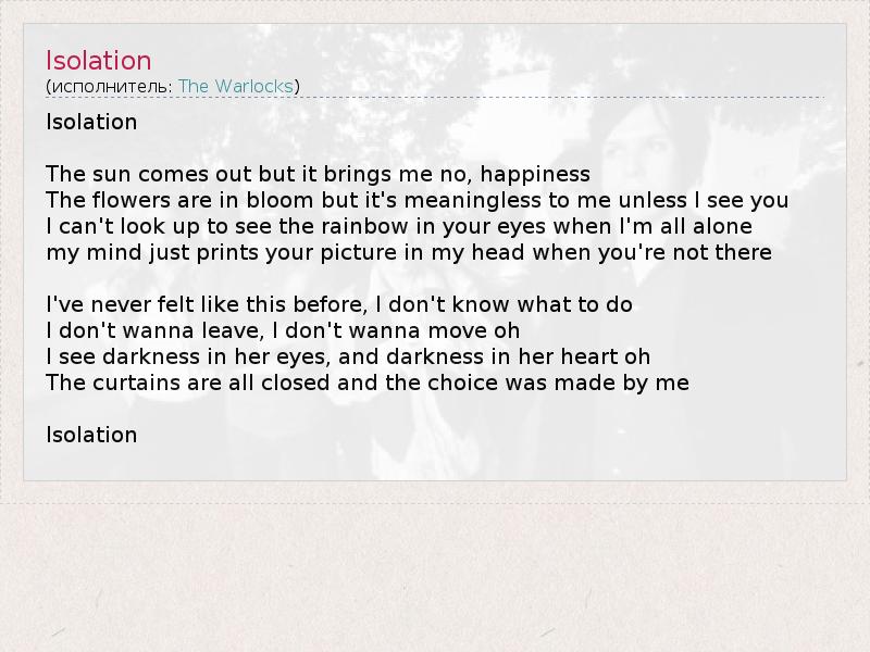 Isolation The sun comes out but it brings me no, happiness The flowers are in bloom but it's meaningless to me unless I see you I can't look up to see the rainbow in your eyes when I'm all alone my mind just prints your picture in my head when you're not there I've never felt like this before, I don't know what to do I don't wanna leave, I don't wanna move oh I see darkness in her eyes, and darkness in her heart oh The curtains are all closed and the choice was made by me Isolation