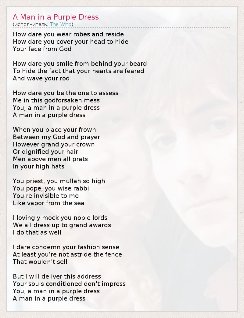 А как ты думаешь, о чем песня "A Man in a Purple Dress" ?
