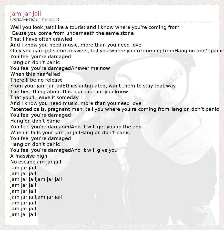 Well you look just like a tourist and I know where you're coming from 'Cause you come from underneath the same stone That I have often crawled And I know you need music, more than you need love Only you can get some answers, tell you where you're coming fromHang on don't panic You feel you're damaged Hang on don't panic You feel you're damagedAnswer me now When this has failed There'll be no release From your jam jar jailEthics antiquated, want them to stay that way The best thing about this place is that you know That you'll leave it someday And I know you need music, more than you need love Patented cells, pregnant men, tell you where you're coming fromHang on don't panic You feel you're damaged Hang on don't panic You feel you're damagedAnd it will get you in the end When it fails your jam jar jailHang on don't panic You feel you're damaged Hang on don't panic You feel you're damagedAnd it will give you A massive high No escapeJam jar jail Jam jar jail Jam jar jail Jam jar jailJam jar jail Jam jar jail Jam jar jail Jam jar jailJam jar jail Jam jar jail Jam jar jail Jam jar jail