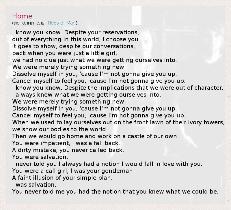 Я знаю, вы знаете . Несмотря бронировании , из все в этом мире , я выбираю тебя . Это говорит о том, , несмотря на наши разговоры , назад, когда вы были всего лишь маленькая девочка , мы понятия не имели, что мы получали нас . Мы просто пытались что-то новое . Растворите себя в вас , потому что я не собираюсь дать вам до . Отменить себя чувствовать тебя , потому что я не собираюсь дать вам до . Я знаю, вы знаете . Несмотря на последствия , что мы были не в характере . Я всегда знал, что мы получали нас . Мы просто пытались что-то новое . Растворите себя в вас , потому что я не собираюсь дать вам до . Отменить себя чувствовать тебя , потому что я не собираюсь дать вам до . Когда мы использовали , чтобы заложить себя на лужайке перед их башнях из слоновой кости , мы показываем наши тела в мире . Тогда мы пошли бы домой и работать на замке самостоятельно. Вы были нетерпеливы , я был осенью обратно . Грязный ошибка , вы никогда не перезванивал . Вы были спасением , Я никогда не говорил вам, что я всегда была понятие я бы влюбиться в вас . Вы были девушкой по вызову , я был твоим джентльмен - Слабый иллюзия вашей простой план . Я был спасением . Ты никогда не говорил мне, что ты имел представление, что вы знали , что мы могли бы быть .