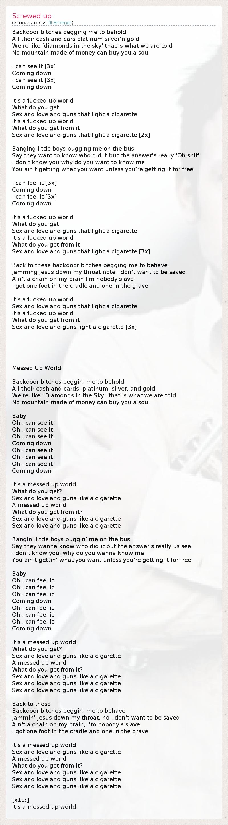 Backdoor bitches begging me to behold All their cash and cars platinum silver'n gold We're like ‘diamonds in the sky' that is what we are told No mountain made of money can buy you a soul I can see it [3x] Coming down I can see it [3x] Coming down It's a fucked up world What do you get Sex and love and guns that light a cigarette It's a fucked up world What do you get from it Sex and love and guns that light a cigarette [2x] Banging little boys bugging me on the bus Say they want to know who did it but the answer's really 'Oh shit' I don't know you why do you want to know me You ain't getting what you want unless you're getting it for free I can feel it [3x] Coming down I can feel it [3x] Coming down It's a fucked up world What do you get Sex and love and guns that light a cigarette It's a fucked up world What do you get from it Sex and love and guns that light a cigarette [3x] Back to these backdoor bitches begging me to behave Jamming Jesus down my throat note I don't want to be saved Ain't a chain on my brain I'm nobody slave I got one foot in the cradle and one in the grave It's a fucked up world Sex and love and guns that light a cigarette It's a fucked up world What do you get from it Sex and love and guns light a cigarette [3x] Messed Up World Backdoor bitches beggin' me to behold All their cash and cards, platinum, silver, and gold We're like "Diamonds in the Sky" that is what we are told No mountain made of money can buy you a soul Baby Oh I can see it Oh I can see it Oh I can see it Coming down Oh I can see it Oh I can see it Oh I can see it Coming down It's a messed up world What do you get? Sex and love and guns like a cigarette A messed up world What do you get from it? Sex and love and guns like a cigarette Sex and love and guns like a cigarette Bangin' little boys buggin' me on the bus Say they wanna know who did it but the answer's really us see I don't know you, why do you wanna know me You ain't gettin' what you want unless you're getting it for free Baby Oh I can feel it Oh I can feel it Oh I can feel it Coming down Oh I can feel it Oh I can feel it Oh I can feel it Coming down It's a messed up world What do you get? Sex and love and guns like a cigarette A messed up world What do you get from it? Sex and love and guns like a cigarette Sex and love and guns like a cigarette Sex and love and guns like a cigarette Back to these Backdoor bitches beggin' me to behave Jammin' Jesus down my throat, no I don't want to be saved Ain't a chain on my brain, I'm nobody's slave I got one foot in the cradle and one in the grave It's a messed up world Sex and love and guns like a cigarette A messed up world What do you get from it? Sex and love and guns like a cigarette Sex and love and guns like a cigarette Sex and love and guns like a cigarette [x11:] It's a messed up world