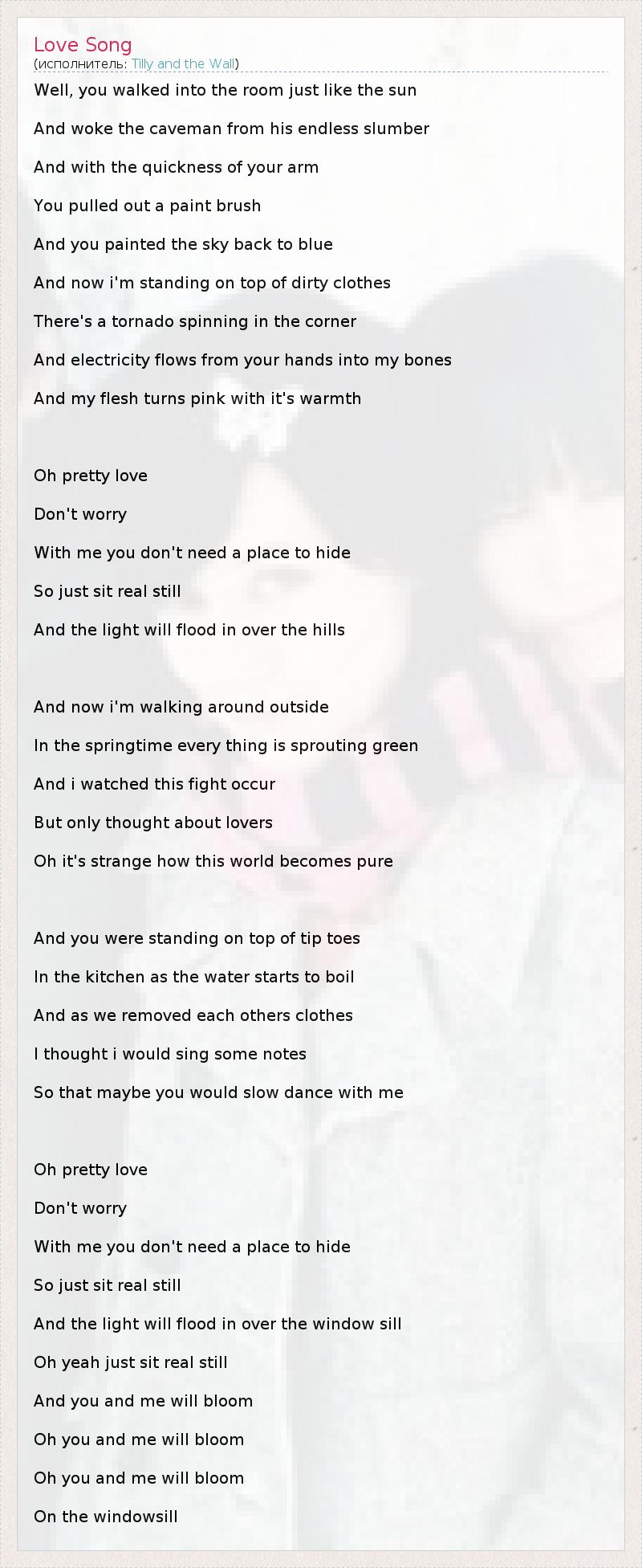 Well, you walked into the room just like the sun And woke the caveman from his endless slumber And with the quickness of your arm You pulled out a paint brush And you painted the sky back to blue And now i'm standing on top of dirty clothes There's a tornado spinning in the corner And electricity flows from your hands into my bones And my flesh turns pink with it's warmth Oh pretty love Don't worry With me you don't need a place to hide So just sit real still And the light will flood in over the hills And now i'm walking around outside In the springtime every thing is sprouting green And i watched this fight occur But only thought about lovers Oh it's strange how this world becomes pure And you were standing on top of tip toes In the kitchen as the water starts to boil And as we removed each others clothes I thought i would sing some notes So that maybe you would slow dance with me Oh pretty love Don't worry With me you don't need a place to hide So just sit real still And the light will flood in over the window sill Oh yeah just sit real still And you and me will bloom Oh you and me will bloom Oh you and me will bloom On the windowsill