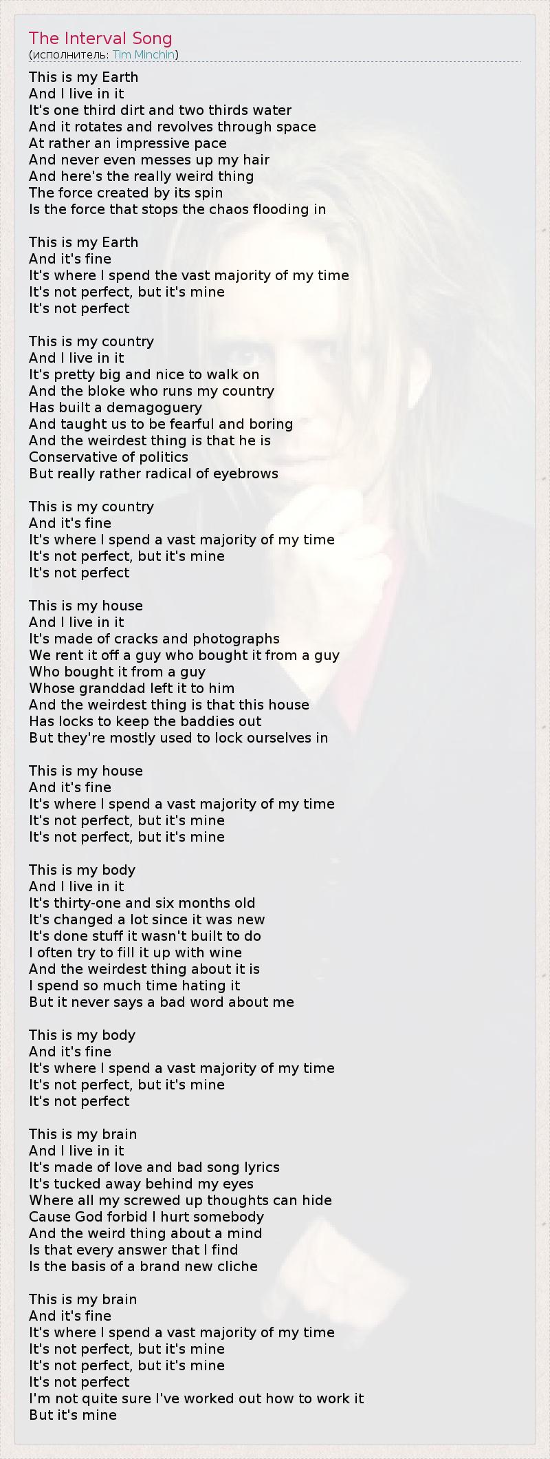 This is my Earth And I live in it It's one third dirt and two thirds water And it rotates and revolves through space At rather an impressive pace And never even messes up my hair And here's the really weird thing The force created by its spin Is the force that stops the chaos flooding in This is my Earth And it's fine It's where I spend the vast majority of my time It's not perfect, but it's mine It's not perfect This is my country And I live in it It's pretty big and nice to walk on And the bloke who runs my country Has built a demagoguery And taught us to be fearful and boring And the weirdest thing is that he is Conservative of politics But really rather radical of eyebrows This is my country And it's fine It's where I spend a vast majority of my time It's not perfect, but it's mine It's not perfect This is my house And I live in it It's made of cracks and photographs We rent it off a guy who bought it from a guy Who bought it from a guy Whose granddad left it to him And the weirdest thing is that this house Has locks to keep the baddies out But they're mostly used to lock ourselves in This is my house And it's fine It's where I spend a vast majority of my time It's not perfect, but it's mine It's not perfect, but it's mine This is my body And I live in it It's thirty-one and six months old It's changed a lot since it was new It's done stuff it wasn't built to do I often try to fill it up with wine And the weirdest thing about it is I spend so much time hating it But it never says a bad word about me This is my body And it's fine It's where I spend a vast majority of my time It's not perfect, but it's mine It's not perfect This is my brain And I live in it It's made of love and bad song lyrics It's tucked away behind my eyes Where all my screwed up thoughts can hide Cause God forbid I hurt somebody And the weird thing about a mind Is that every answer that I find Is the basis of a brand new cliche This is my brain And it's fine It's where I spend a vast majority of my time It's not perfect, but it's mine It's not perfect, but it's mine It's not perfect I'm not quite sure I've worked out how to work it But it's mine