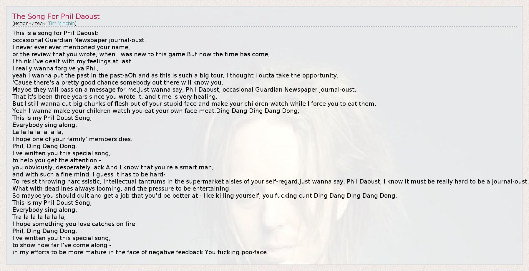 This is a song for Phil Daoust: occasional Guardian Newspaper journal-oust. I never ever ever mentioned your name, or the review that you wrote, when I was new to this game.But now the time has come, I think I've dealt with my feelings at last. I really wanna forgive ya Phil, yeah I wanna put the past in the past-aOh and as this is such a big tour, I thought I outta take the opportunity. 'Cause there's a pretty good chance somebody out there will know you, Maybe they will pass on a message for me.Just wanna say, Phil Daoust, occasional Guardian Newspaper journal-oust, That it's been three years since you wrote it, and time is very healing. But I still wanna cut big chunks of flesh out of your stupid face and make your children watch while I force you to eat them. Yeah I wanna make your children watch you eat your own face-meat.Ding Dang Ding Dang Dong, This is my Phil Doust Song, Everybody sing along, La la la la la la la, I hope one of your family' members dies. Phil, Ding Dang Dong. I've written you this special song, to help you get the attention - you obviously, desperately lack.And I know that you're a smart man, and with such a fine mind, I guess it has to be hard- To resist throwing narcissistic, intellectual tantrums in the supermarket aisles of your self-regard.Just wanna say, Phil Daoust, I know it must be really hard to be a journal-oust. What with deadlines always looming, and the pressure to be entertaining. So maybe you should quit and get a job that you'd be better at - like killing yourself, you fucking cunt.Ding Dang Ding Dang Dong, This is my Phil Doust Song, Everybody sing along, Tra la la la la la la, I hope something you love catches on fire. Phil, Ding Dang Dong. I've written you this special song, to show how far I've come along - in my efforts to be more mature in the face of negative feedback.You fucking poo-face.